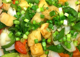 Serves 8. Tofu with ginger, onions, bell peppers, and mushrooms.